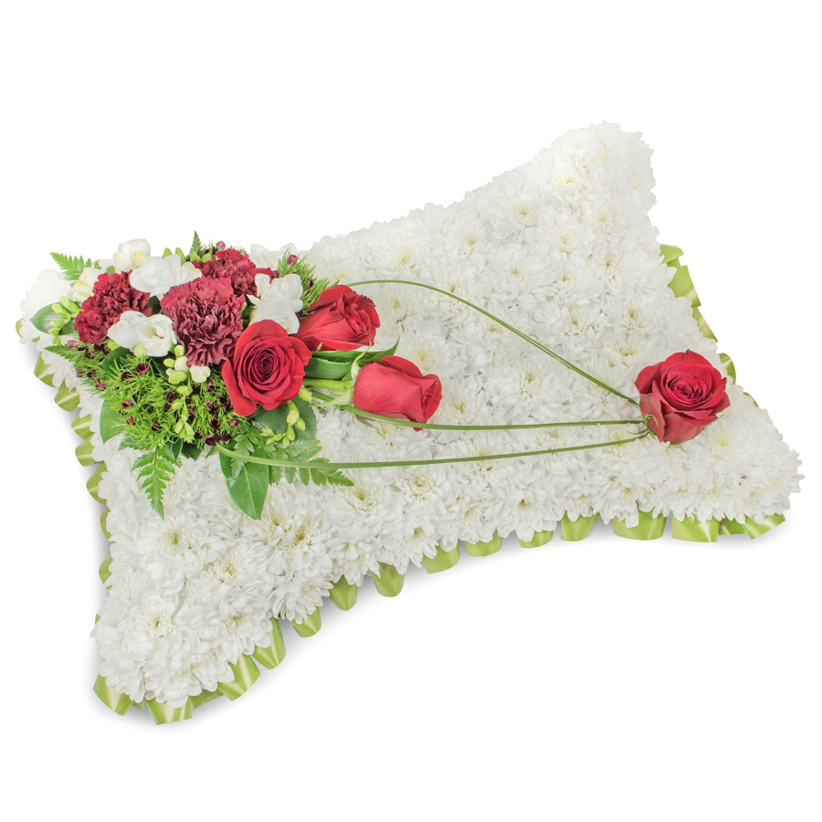 Convey your sincere condolences with our sophisticated sympathy flower bouquet. This elegant arrangement combines the timeless beauty of white chrysanthemums, the classic charm of red roses, delicate white freesias, rich dark red carnations, along with dianthus and bear grass to create a meaningful tribute.